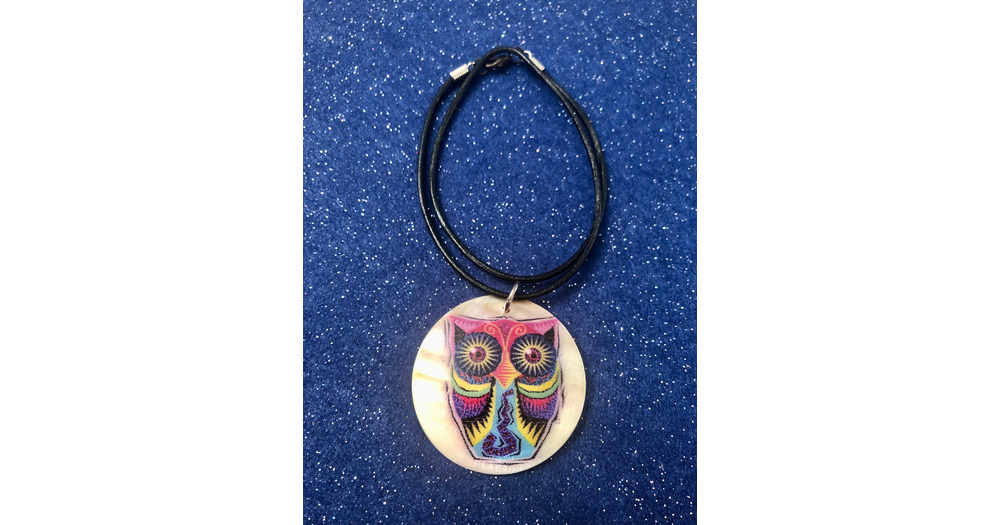 Colorful Shell Owl Necklace: Black Leather Cord Jewelry