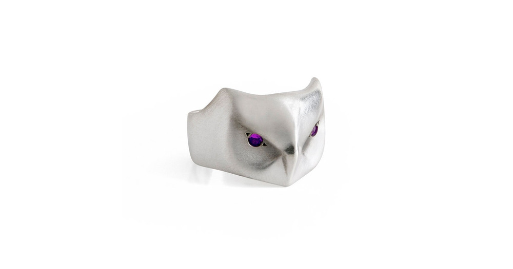 Sterling Silver Great Horned Owl Ring, Amethyst Eyes, February Birthstone