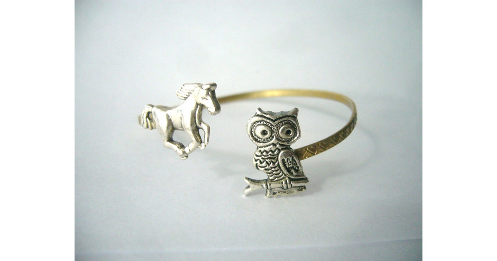 owl cuff bracelet with a horse, wrap style, animal bracelet, charm bracelet, bangle