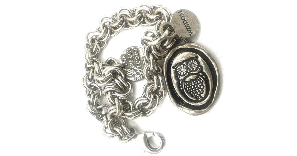 Owl Wisdom Charm Bracelet Pendant Double Link Silver tone Chain Lobster Clasp