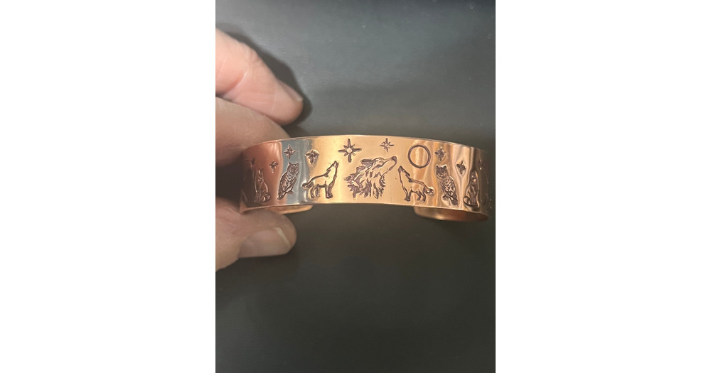 WOLF'S Howling With Owls and Fox on Sides Hand Crafted Solid Copper Bracelet -Mountains-Stars &a
