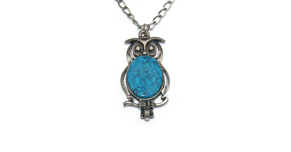 Vintage Fuller Silver Tone and Faux Turquoise Owl Pendant on 30 Silver Tone Chain. "F" in