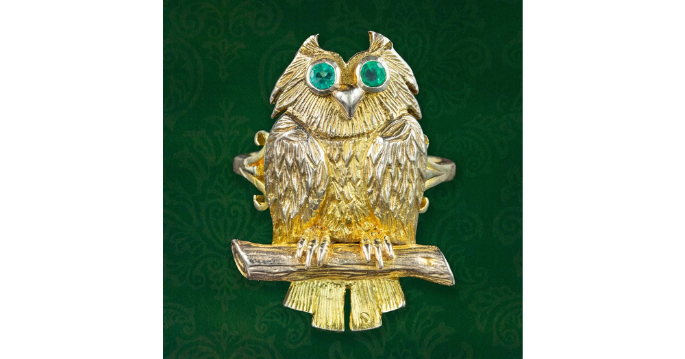 Vintage Owl Ring Emerald Eyes Dated 1972