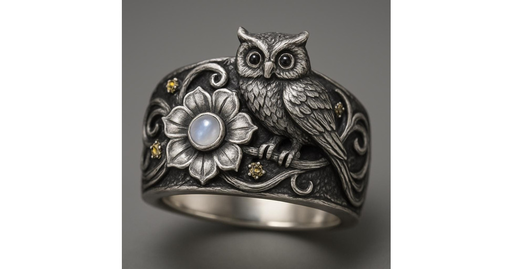 Sterling Silver Owl Ring Wide Band Flower Gemstone Statement Ring, Vintage Owl Jewelry, Boho Nature