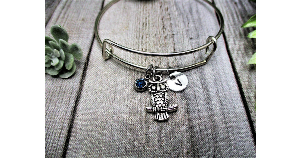 Owl Charm Bracelet W/ Birthstone Owl Lovers Initial Bangle Bracelet Animal Jewelry Gift for Her Birt
