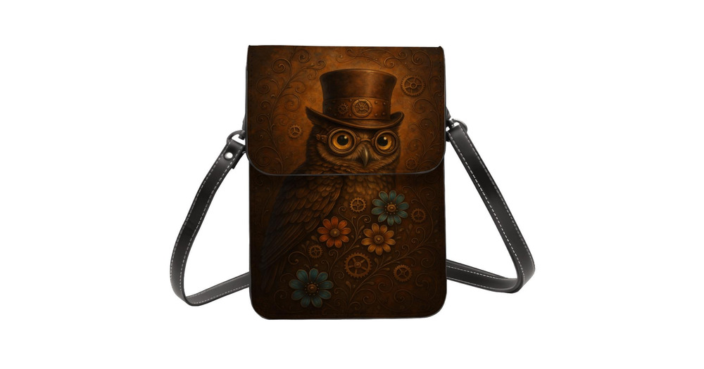 Steampunk Owl Cell Phone Crossbody or Shoulder Bag, Vintage Gears PU Leather