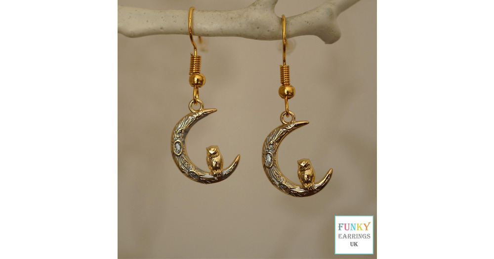 Gold Owl on Moon Drop Earrings: 18k Plated Enamel Jewelry