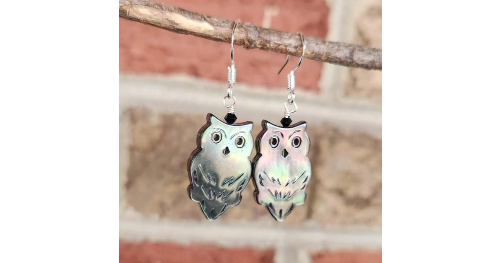 Genuine Black Mother of Pearl Owl Design Earrings Embellished with a Swarovski Crystal on a 925 Ster