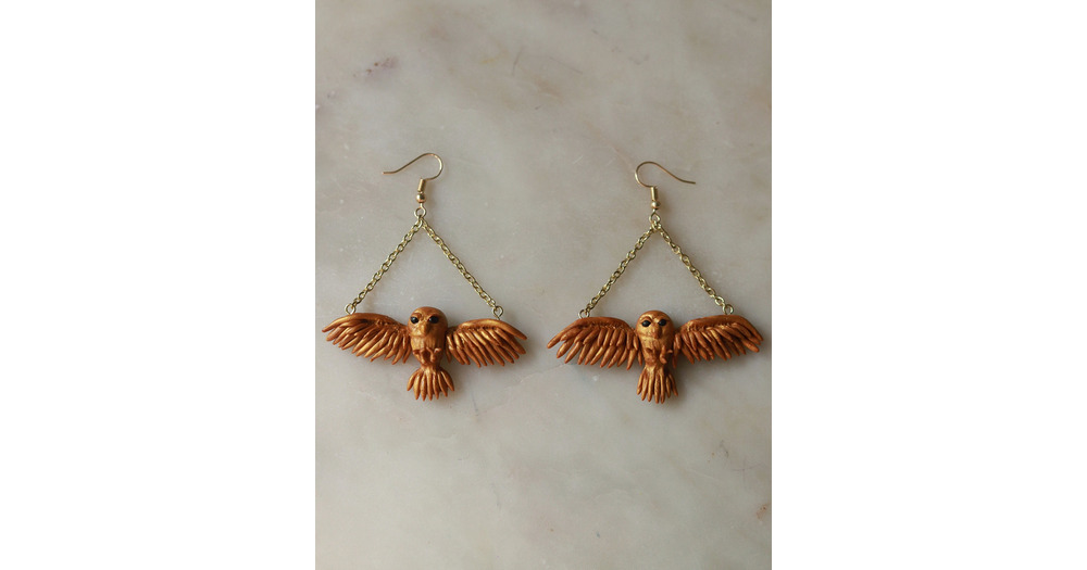 Gold owl earrings Hedwig dangle earrings bird in flight earrings Golden wings expanded jewelry Fores