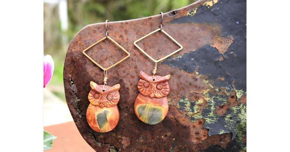 Boucles d'oreilles crochets en niobium Hiboux en Jaspe Picasso de 32/21mm