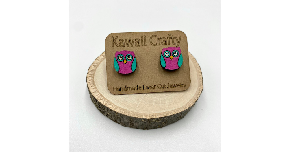 Hand Painted Wood Owl Stud Earrings, Magenta + Teal