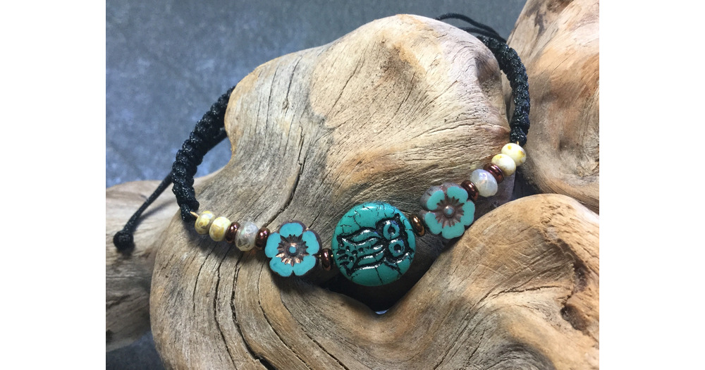 Beaded Czech Turquoise Glass Owl Adjustable Bracelet, white copper and turquoise knotted bracelet, b