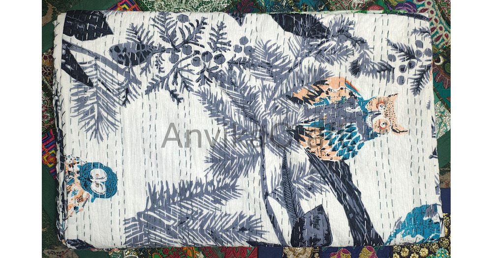 Handmade Owl Print Kantha Quilt: Indian Vintage Cotton Throw Blanket