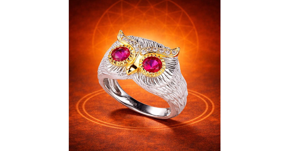 Crimson Gaze Owl Ring, Feathered Wisdom: Ruby-Eyed Owl Ring, Guardian of the Night – Diamond &
