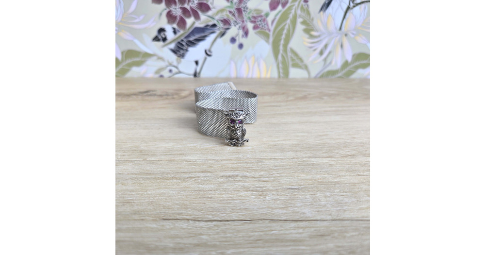 Vintage Sarah Coventry Owl Mesh Bracelet - Silvertone 1970s - Purple Rhinestone Eyes - Adjustable Bu