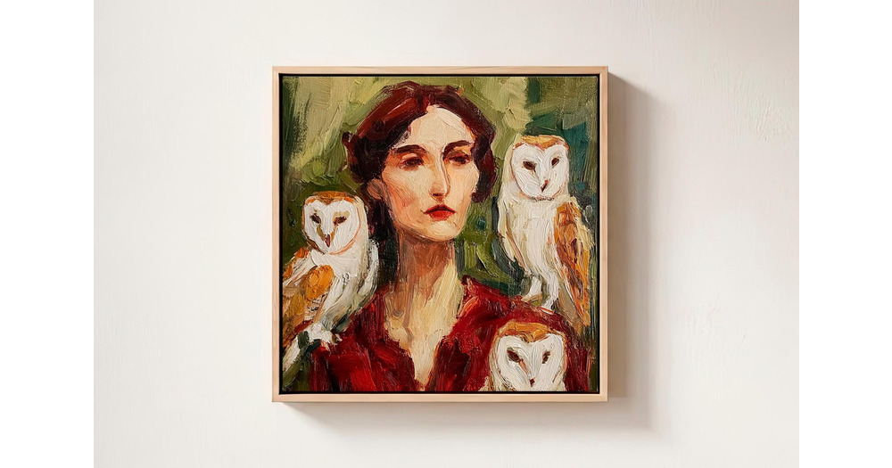 Woman Portrait with Owls Oil Painting Canvas Large Original Folk Art Bird Wall Art by ArtSenya