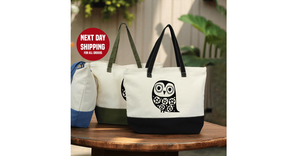 Owl Tote Bag: Soft Cotton, Zippered with Inner Pocket - Everyday Use