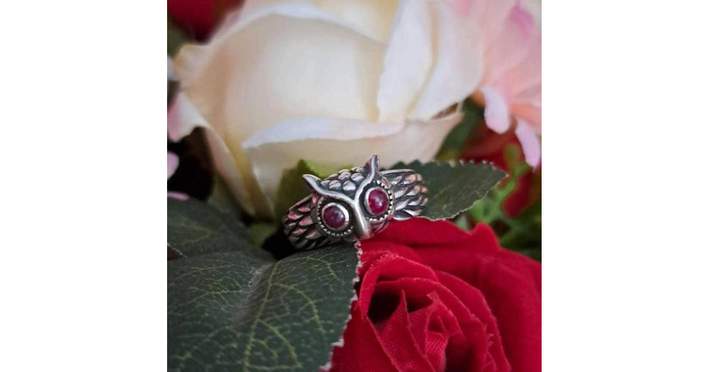 oxidized Sterling Silver Owl Ring with red ruby eyes signet ring