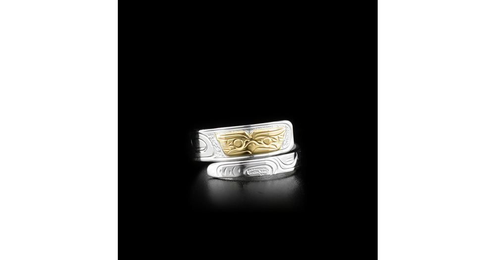 Northwest Coast Indigenous, Hand Carved Wrapped Owl Sterling Silver and 14K Gold Ring, First Nations