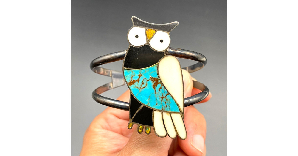 Vintage Southwestern Owl Bird Turquoise Inlay Silver Bracelet Cuff Small 6-1/4"