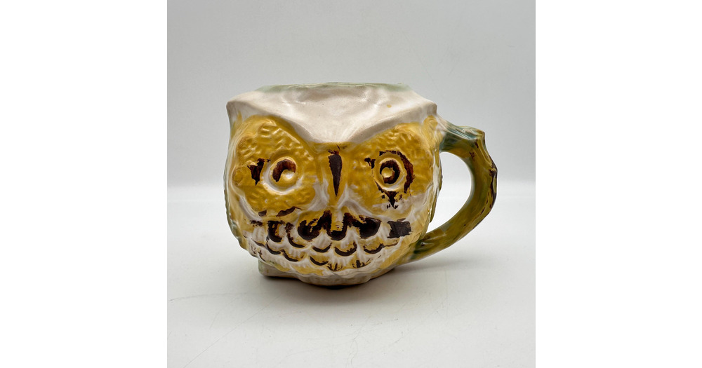 1969 Pacific Stoneware Pottery Owl Mug, Artist Signed, B. Welsh, 4 1/4” tall
