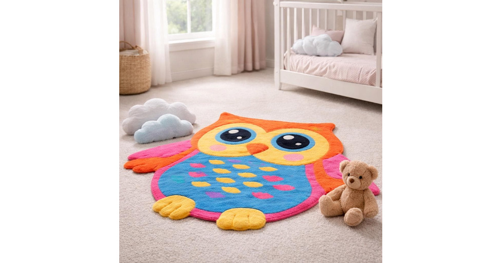 Colorful Owl Kids Rug – Hand Tufted Wool Nursery Carpet, Soft Plush Play Mat for Baby Room, Cu