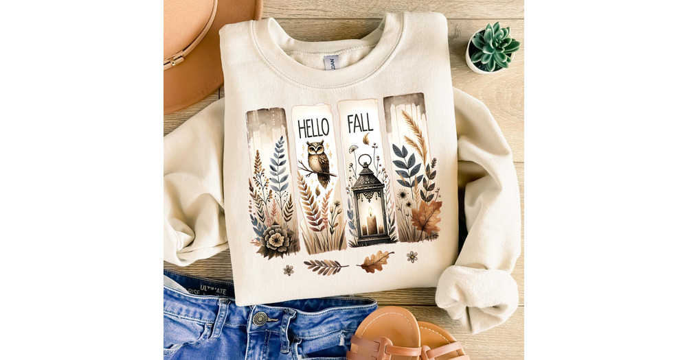 Hello Fall Brushstroke PNG Sublimation Design with Owl Lantern Autumn Leaves Rustic Watercolor Clipa