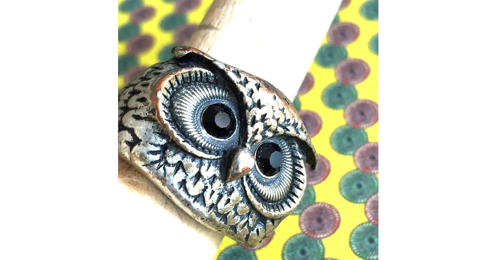 Vintage Unisex Men Women Silver Metal Oversized Ring - In relief Owl Design & In relief Feathers