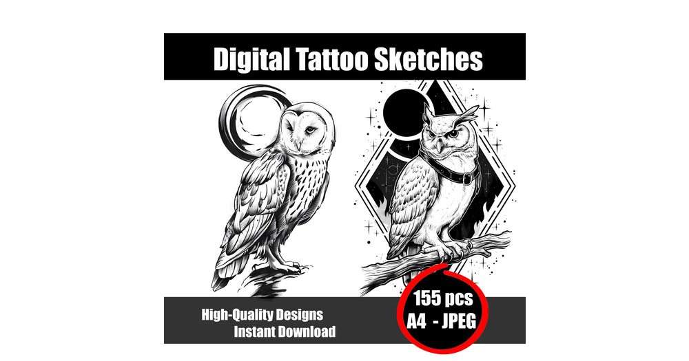Owl Tattoo Sketch | Detailed Line Art Flash Design | Printable Bird Tattoo for Artists | Instant Dig