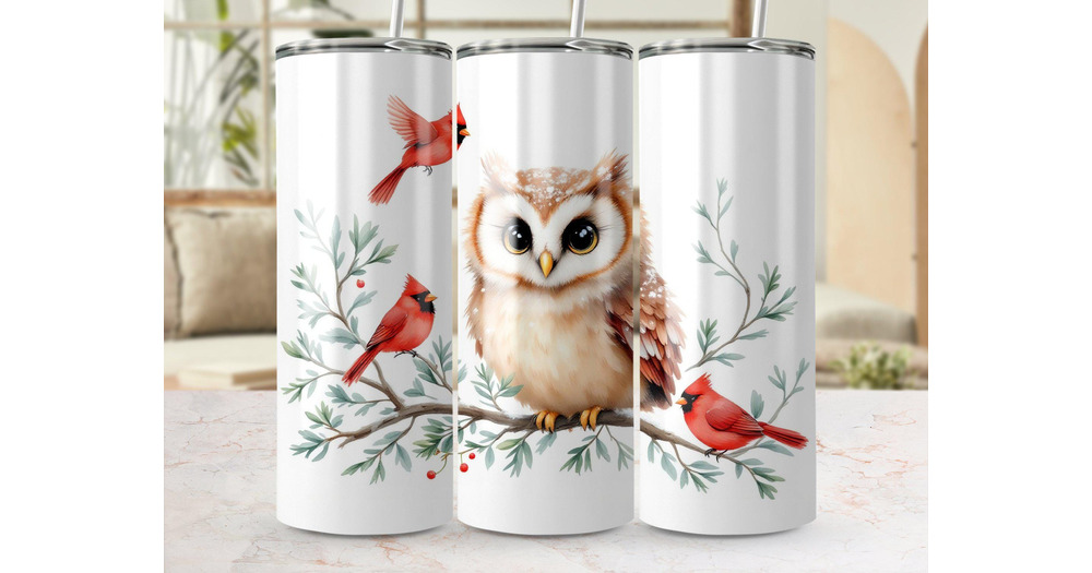 Owl and Cardinals Vintage Tumbler Wrap, Woodland PNG File (Digital Download)