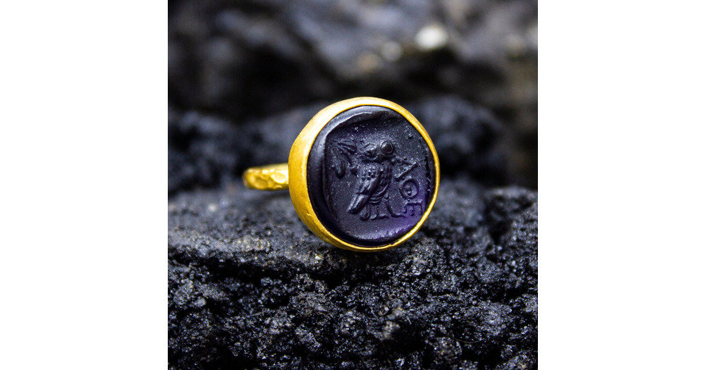 Greek Athena Owl Intaglio Glass Ring | 925 Sterling Silver | Ancient Roman Owl Carving Ring | Mythol