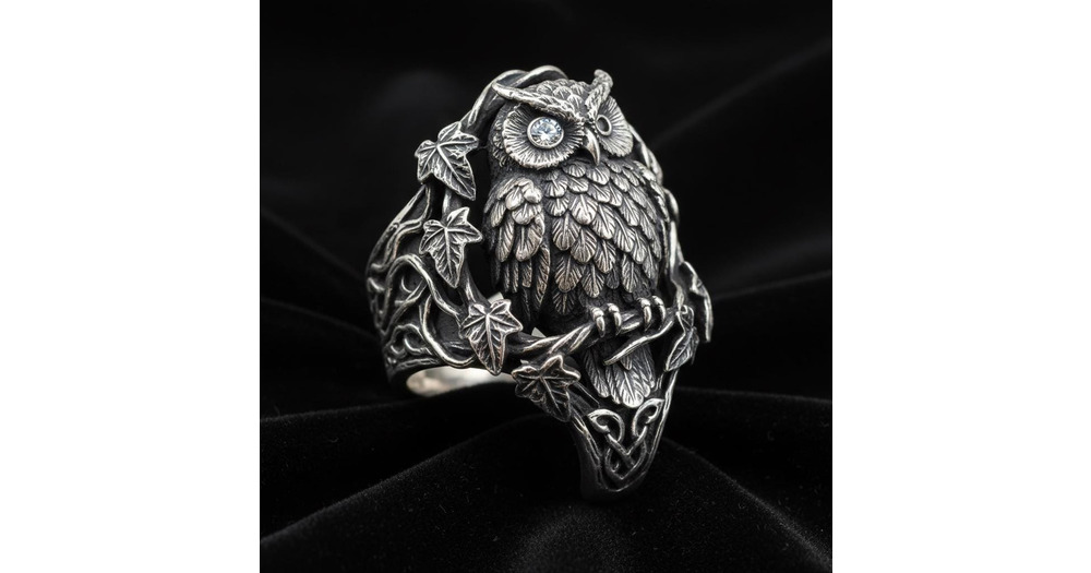 925 Sterling Silver Owl Ring with Blue Gem & Leaf Vines, Vintage Statement Nature Jewelry