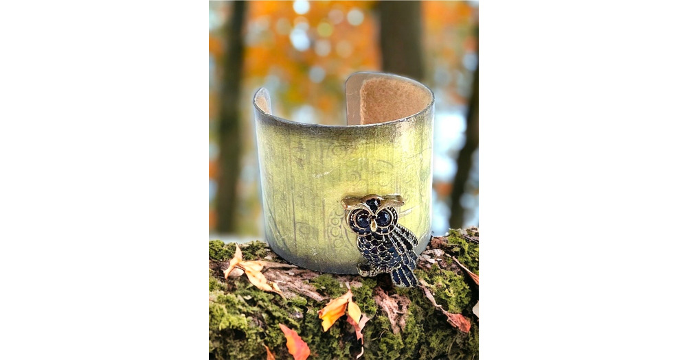 Vintage handmade green cuff bracelet with owl