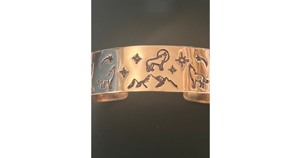 WOLF'S Howling With Owls and Fox on Sides Hand Crafted Solid Copper Bracelet -Mountains-Stars &a