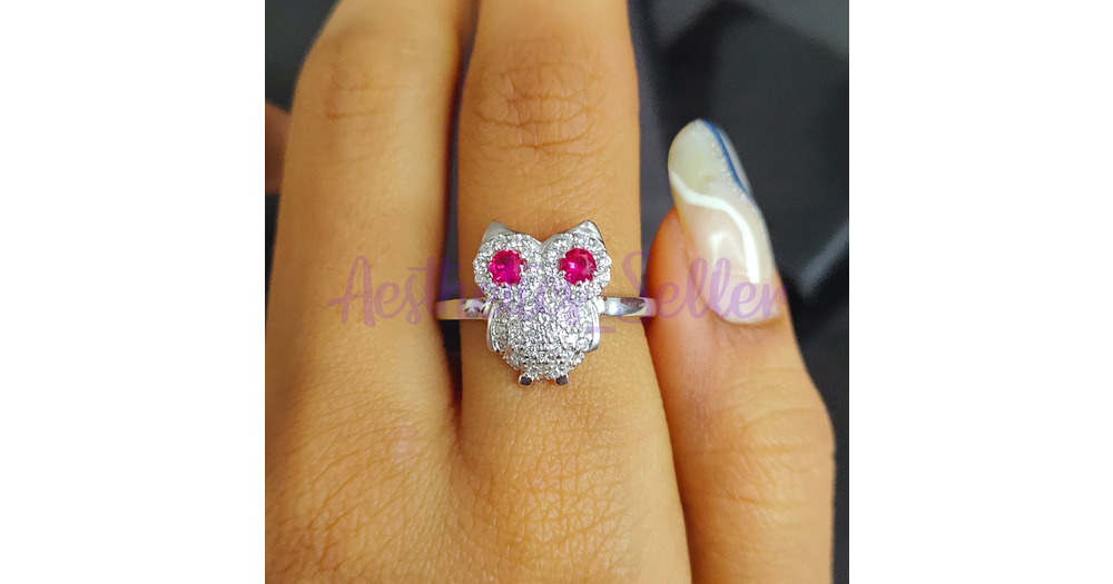 Sterling Silver Owl Ring with Red Eyes, Animal Jewelry
