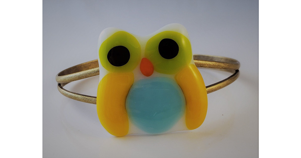 Fused Glass Owl Bracelet: Antique Brass Bangle, Whimsical Jewelry