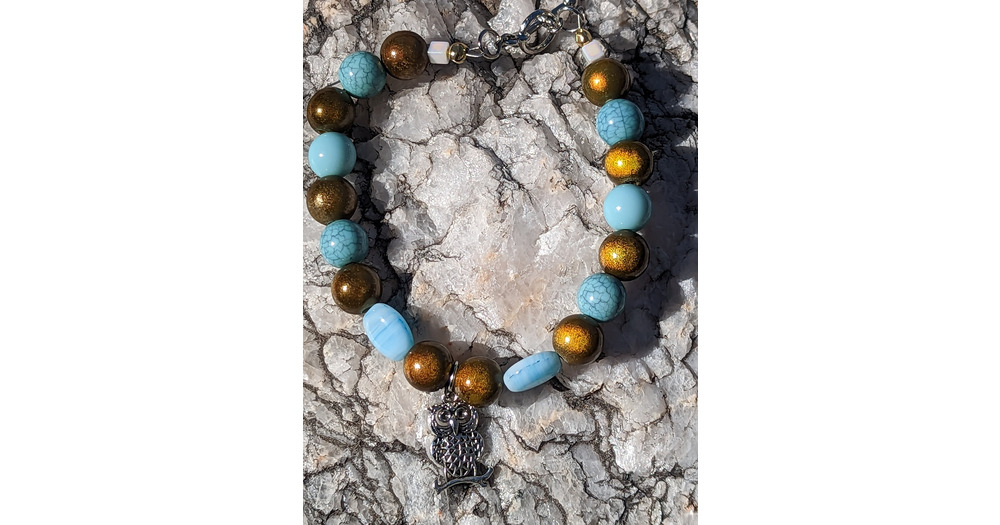 Beaded Owl Bracelet, Blue & Green Stone Charm Bracelet