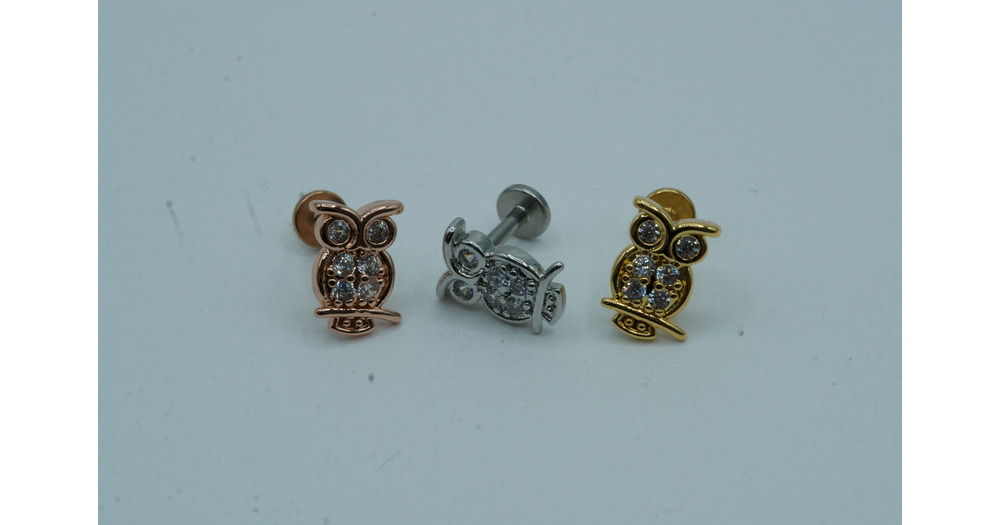CZ Paved Owl Flat Back Stud Earrings Screw In Internally Threaded 316L Surgical Steel Gold Cartilage