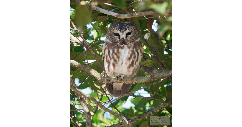 Beautiful photograph of a Northern Saw-whet Owl perched in a Holly tree, Greenwich, Connecticut