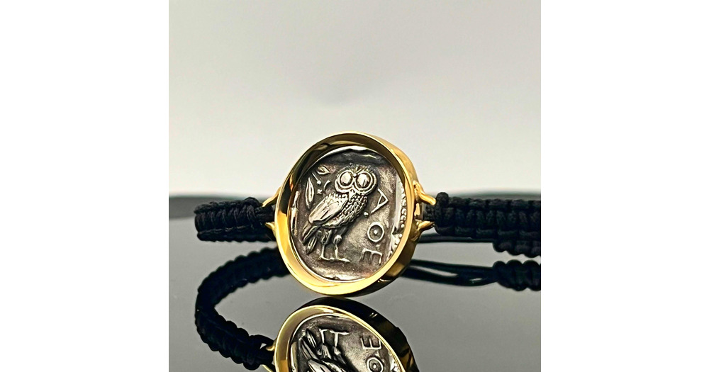 Athena Owl Coin Bracelet: Greek Mythology Jewelry (Adjustable Macrame, Gold-Plated)
