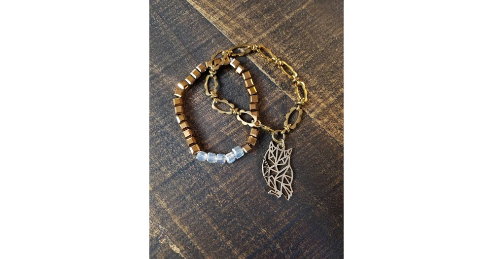 Owl charm bracelet, stretch glass bead bracelet , Brass Chain bracelet