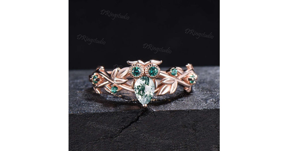 Owl Teardrop Moss Agate Engagement Ring Branch Leaf Vine Aquatic Agate Emerald Wedding Ring Nature S