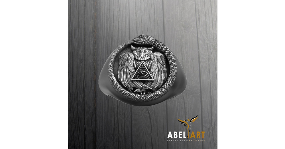 Ouroboros Owl Signet Ring: Sterling Silver Illuminati Symbol Jewelry