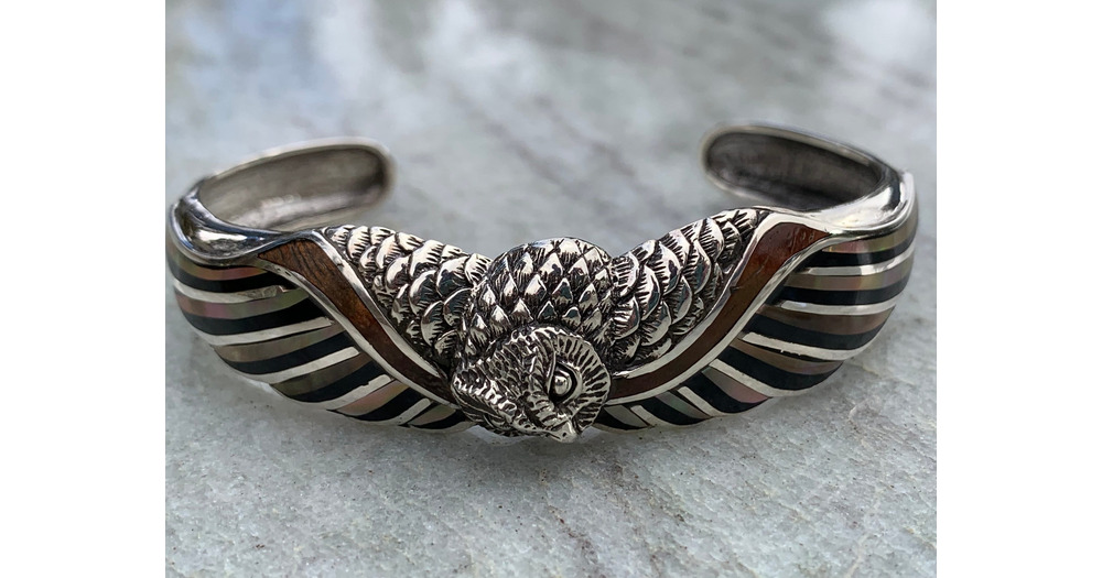 Sterling Silver Owl Cuff Bracelet, Koa Wood, Mother of Pearl