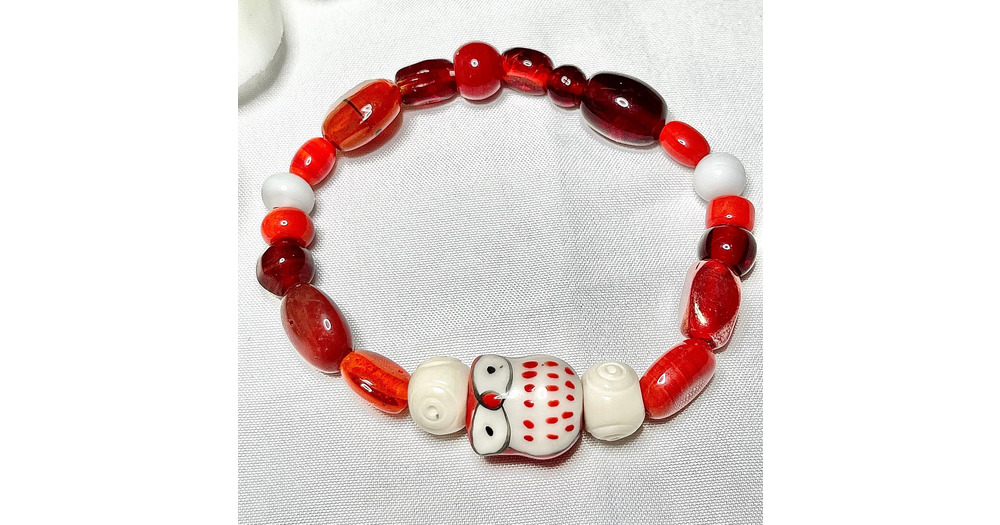 Red Ceramic Owl Bracelet: Beaded Stretch Jewelry
