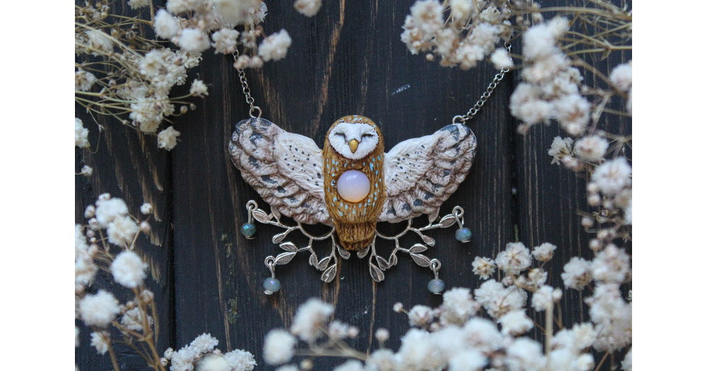Barn Owl Opalite Necklace: Polymer Clay Bird Pendant