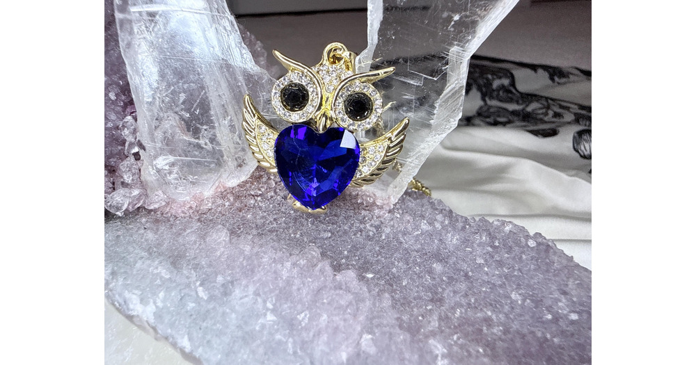 Santa Muerte Owl Necklace – Gold-Tone with Deep Sapphire Blue Heart CZ | Protection • Wis