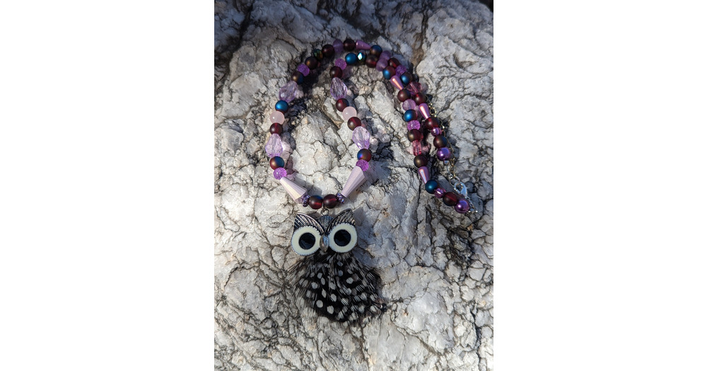 Beaded Owl Necklace, Feather Charm, Adjustable Length