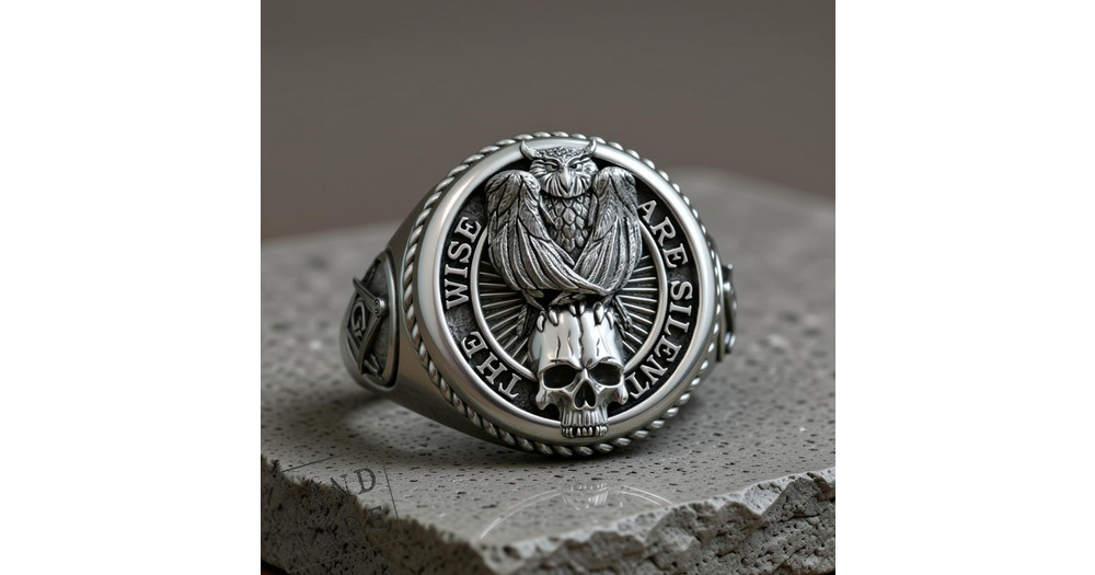 Owl Skull Silver Ring, Masonic Compass (Handmade Signet)