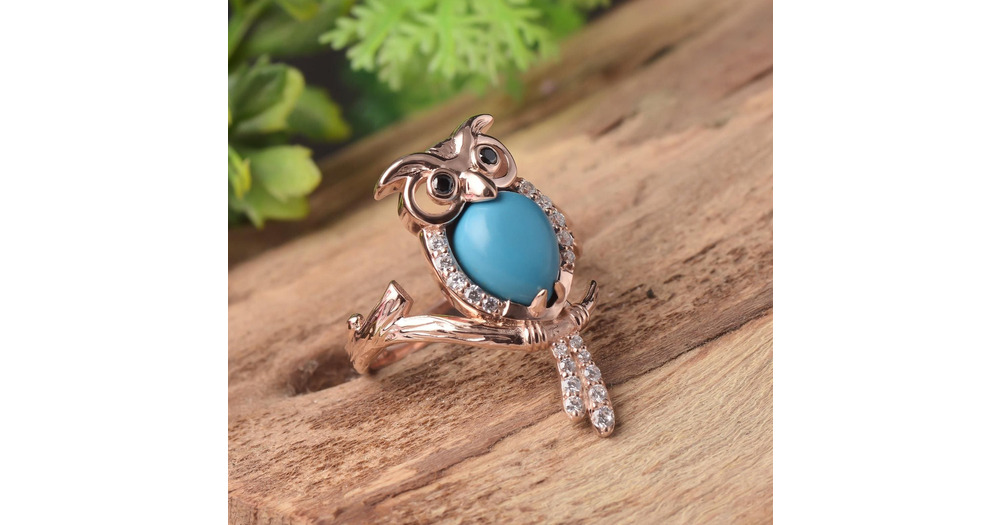Gold Plated Sterling Silver Owl Ring: Turquoise & Zircon